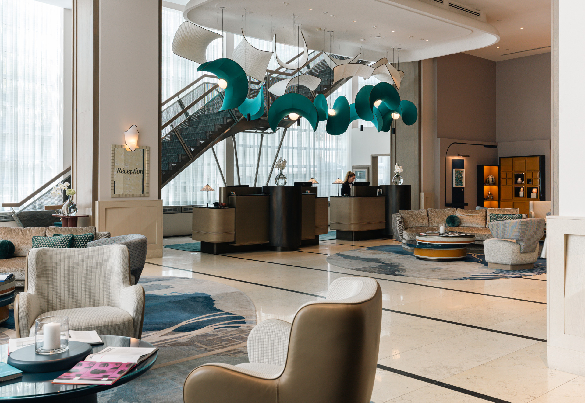 Le hall d’entrée principal se distingue par des détails architecturaux aux lignes arrondies, créant une atmosphère accuillante et raffinées dès les premiers pas.
